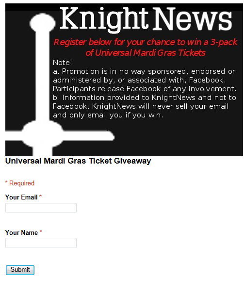Good luck! We’ll announce the winner live on KnightNews.com by March 24. If you have any questions about how to register, email us at news@knightnews.com. Also, see the full terms and conditions on the next page: