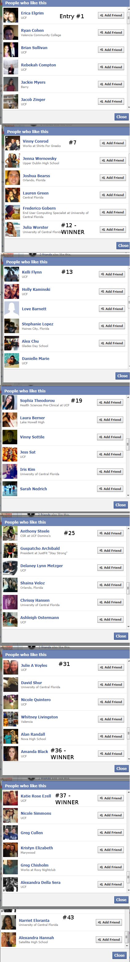 Selection of Winners is FINAL – we made every attempt to be fair and accurate and are not responsible for mistakes. Entries in order as seen when logged into Facebook as KnightNews.