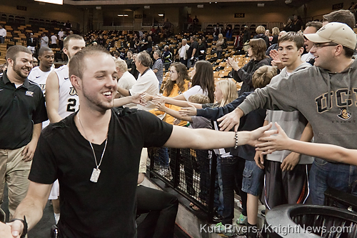 UCF forward Josh Crittle (24) celebrating on the sidelines at UCF Arena on November 18, 2011 in Orlando, Florida. UCF defeated High Point 84-72. (Kurt Rivers/KnightNews.com)