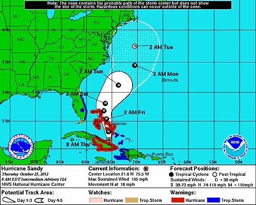 But Hurricane Sandy, which passed over Cuba last night, has the potential to collide with an early winter storm from the east and an arctic blast of air from the north, effectively wreaking havoc along the east coast of the United States, according to meteorologist reports.