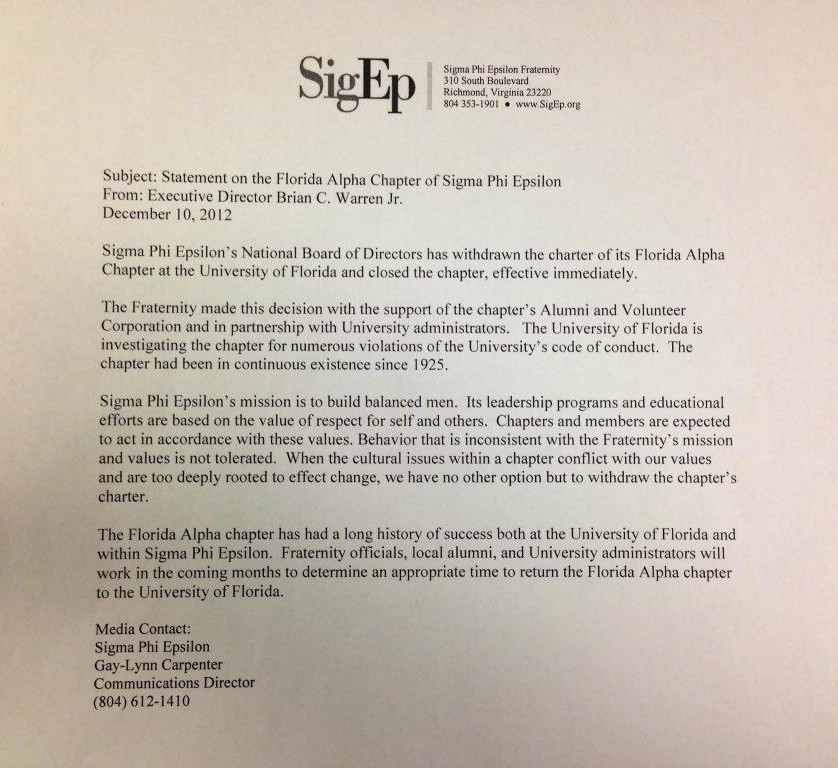 Sig Ep’s Board of Directors has withdrawn the charter of the Florida Alpha Chapter of Sig Ep at UF for several reasons relating to conduct issues.