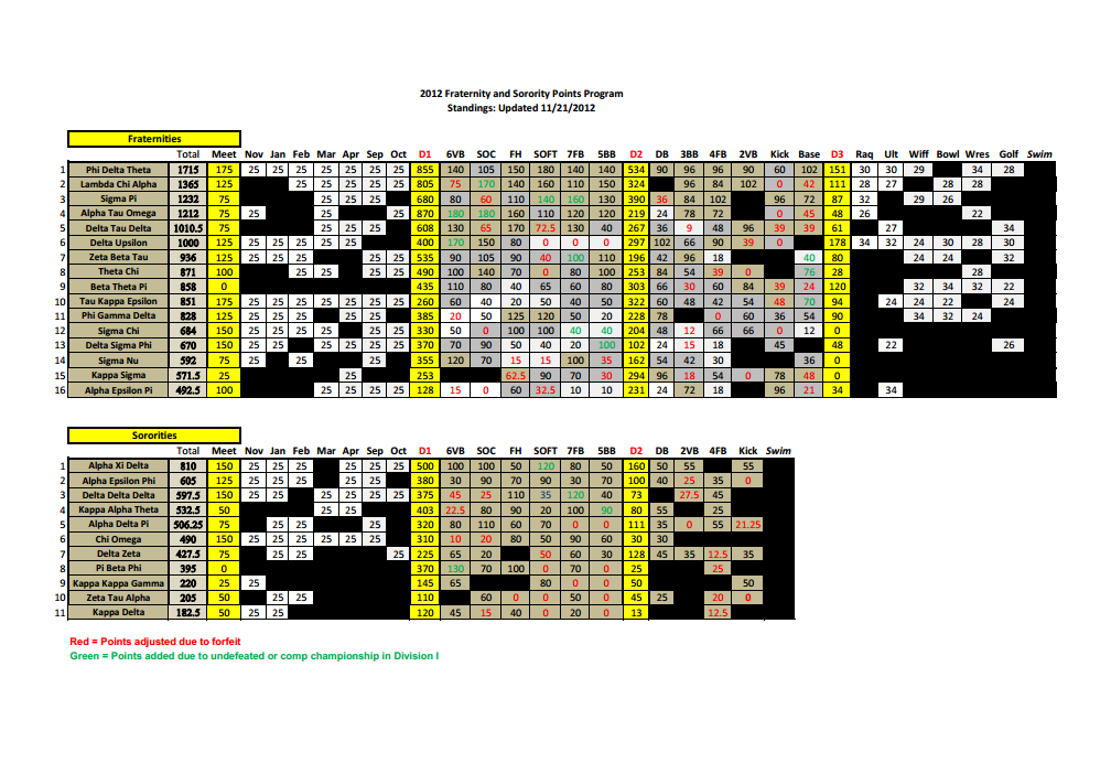 2012 marks the 4th straight year Phi Delt won fraternity sports, a first time accomplishment in UCF Greek Cup history among fraternities. Alpha Delta Pi matched the same accomplishment among sororities beginning in 2002.