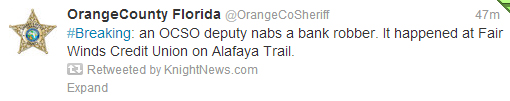 According to Local 6 news, the suspected robber passed a note to the teller but it’s not clear if he got away with anything before being caught a deputy.