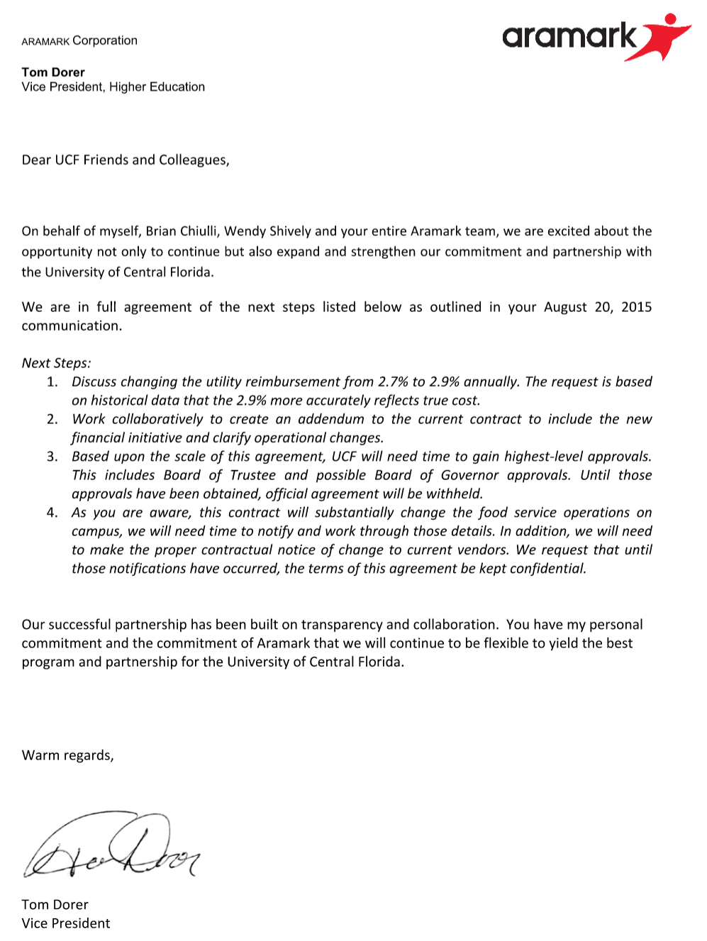 READ: UCF Commitment Letter (waiting on UCF to provide) | Aramark Letter to UCF