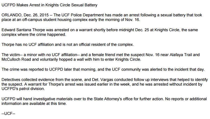 The UCF police department recently sent out a press release announcing the arrest of Edward Santana Thorpe, stating “Thorpe has no UCF affiliation and is not an official resident of the complex.”