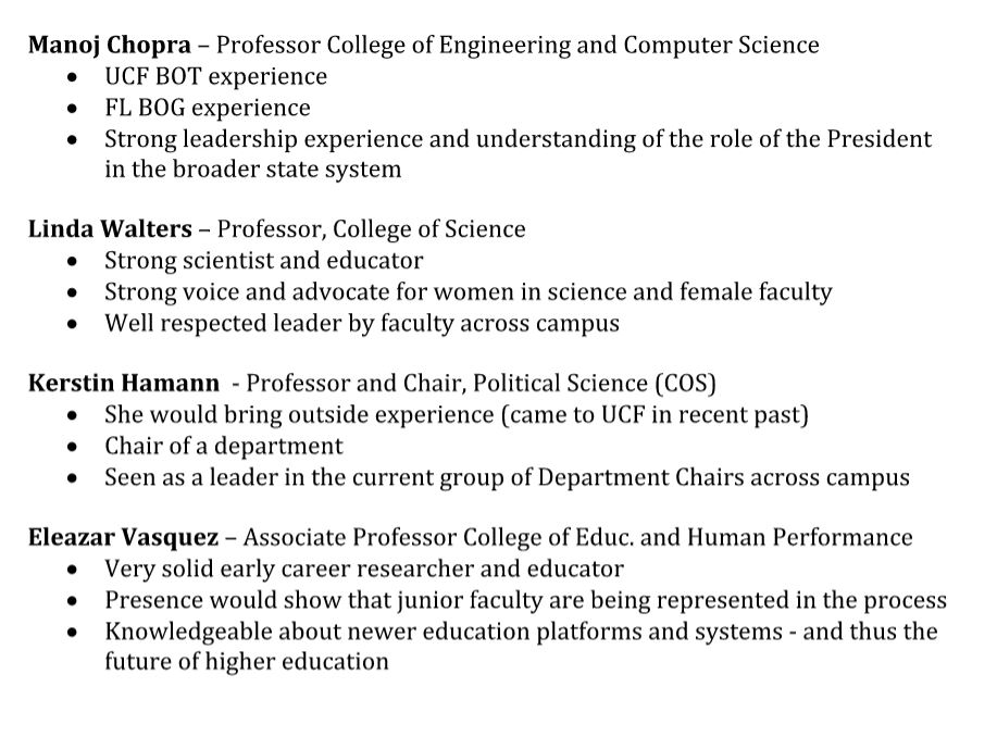 I will be at the game tomorrow if you would like to discuss, or you can call me at 321-[redacted] (cell) as well. I have worked on this for a couple of days and have confidence these faculty would serve well and put the best interests of UCF first in all their work on the committee. I would also volunteer myself – but I understand the need to limit the committee to three trustees given the way the process works.